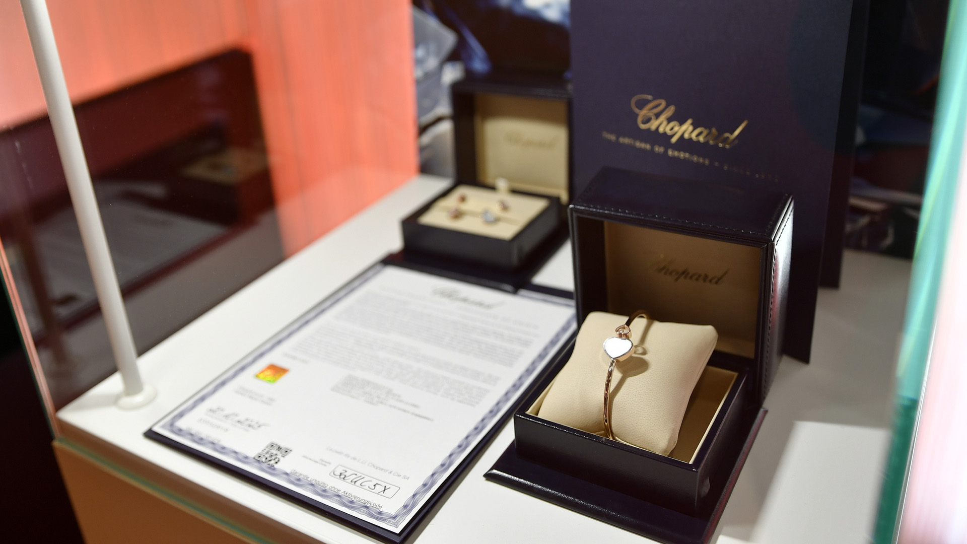 Ein stilvoller Begleiter – dezent im Alltag, glanzvoll am Abend: Das Set aus der Happy Hearts-Kollektion von Chopard besteht aus Ohrringen und einem Armreif aus 18 Karat Roségold, schimmerndem Perlmutt und strahlenden weißen Diamanten.